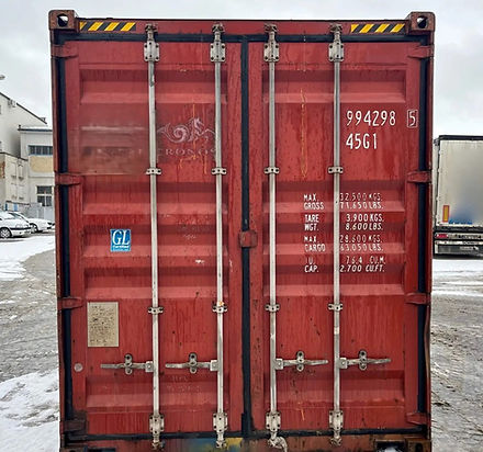 O contentor possui portas duplas com barras de fecho num dos lados e uma caixa de proteção para a fechadura.